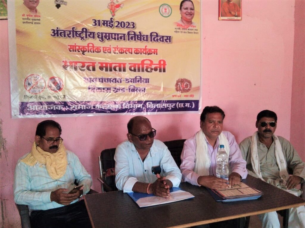 बिलासपुर(गंगा प्रकाश)। अन्तर्राष्ट्रीय धूम्रपान निषेध दिवस 31 मई के अवसर पर ध्रूमपान एवं तम्बाकू निर्मित विभिन्न उत्पादों के सेवन से होने वाले गंभीर दुष्परिणामों के प्रति समाज के सभी वर्गाें में जनचेतना विकसित करने हेतु जिला मुख्यालय के सार्वजनिक स्थलों एवं समस्त विकासखण्डों में जन जागरूकता कार्यक्रम आयोजित किया गया। इस अवसर पर समाज कल्याण विभाग के शासकीय कलापथक दल एवं भारत माता वाहिनी के सदस्यों द्वारा गीत संगीत एवं बेनर, पोस्टर, पाम्पलेट आदि के माध्यम से आमजनों के बीच तम्बाकू सेवन के दुष्प्रभाव पर चर्चा व नशापान के दुष्परिणामों से अवगत कराते हुए नशा न करने का संकल्प लेते हुए शपथ पत्र भरवाया गया।