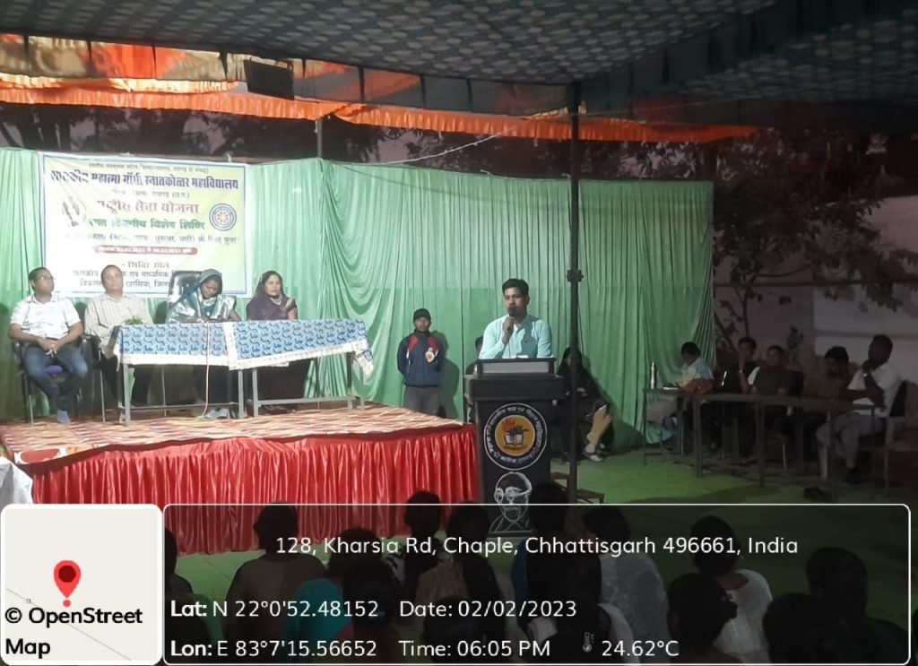 खरसिया (गंगा प्रकाश): शहीद नंदकुमार पटेल विश्वविद्यालय रायगढ़ से संबद्ध शासकीय महात्मा गाँधी स्नात्तकोत्तर महाविद्यालय खरसिया की इकाई राष्ट्रीय सेवा योजना (एनएसएस) के सात दिवसीय शिविर का शुभारंभ हुआ। शिविर का शुभारंभ में ग्राम पंचायत बांसमुड़ा के सरपंच और पंच साथ ही महाविद्यालय के प्राचार्य डॉ आर के तिवारी और एनएसएस के कार्यक्रम अधिकारी डीके भोई और महाविद्यालय प्रो. एम एल धिरहि,जयराम कुर्रे, मनोज बरेठा, आकांक्षा मिश्रा, अजय तिवारी, एस पी तिवारी, डीके नागरे, कुसुम जांगड़े , जे आर कुर्रे व समस्त कर्मचारी उपस्थित रहे है। एनएसएस के शिविर के आयोजन को लेके महाविद्यालय के प्राचार्य ने राष्ट्रीय सेवा योजना के महत्व एवम् शिविर के लाभ को लेके ग्रामवासियों को भरपूर लाभ हेतु देने की स्वयं सेवक और सेविकाओं को बात कही है । इस कार्यक्रम में राष्ट्रीय सेवा योजना द्वारा बेटी बचाओ बेटी पढ़ाओ, नशा मुक्ति, डिजिटल इंडिया आदि के प्रति जागरुकता मुख्य रूप से शामिल रहेगें। इस कार्यक्रम में समस्त शिविरार्थी पूरी तरह से मन लगन के साथ अपने पूरी शिविर की गतिविधि को अनुशासन पूर्वक करने के लिए कार्यक्रम अधिकारी और समस्त महाविद्यालय के कर्मचारी ने शिविरार्थीयों को प्रेरणा दिए है । यह शिविर 8 फरवरी तक संचालित रहेगी।