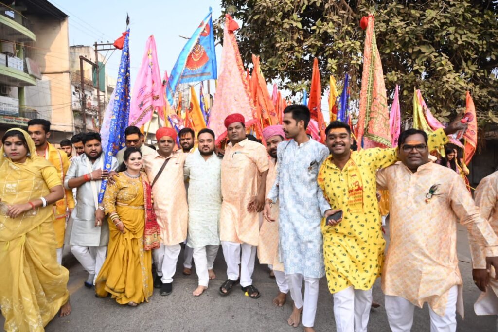 रायपुर (गंगा प्रकाश)। खाटू श्याम के जन्मोत्सव पर श्री श्याम मासिक एकादशी निशान यात्रा गुढ़ियारी द्वारा 26वीं निशान यात्रा रजत उत्सव के साथ निशान यात्रा ढोल-नगाड़ों के साथ निकाली गई। श्याम भक्त हाथों में ध्वजाएं और महिलाएं केसरिया परिधान में पुरुष राजस्थानी वेशभूषा में श्याम भजन गाते हुए मस्ती में झूमते चल रहे थें । इस दौरान जगह-जगह पुष्प वर्षा की गई। निशान यात्रा में खाटू श्याम के जयकारों से नगर का माहौल श्याममय हो गया।