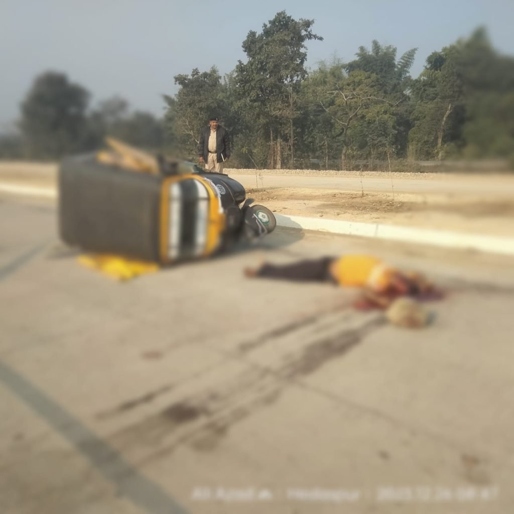 बीच रास्ते में पलटा हुआ सवारी ऑटो और ऑटो चालक की लावारिस अवस्था में मिली लाश