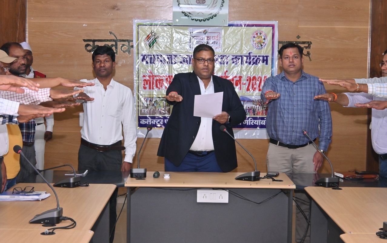 गरियाबंद (गंगा प्रकाश)। कलेक्टर एवं जिला निर्वाचन अधिकारी दीपक कुमार अग्रवाल के निर्देश पर जिले में स्वीप कार्यक्रम अंतर्गत संकल्प गरियाबंद ’’संकल्प एक अभियान-शत प्रतिशत हो मतदान’’ के तहत जिले में लगातार मतदाता जागरूकता से संबंधित गतिविधियों का आयोजन किया जा रहा है। इसी कड़ी में आज लोकसभा निर्वाचन 2024 में शत प्रतिशत मतदान करने के लिए जिला कार्यालय के सभाकक्ष में कलेक्टर श्री अग्रवाल ने अधिकारी-कर्मचारियों को लोकतंत्र में अपनी पूर्ण आस्था रखने, देश की लोकतांत्रिक परम्पराओं की मर्यादा को बनाए रखने, स्वतंत्र, निष्पक्ष एवं शांतिपूर्ण निर्वाचन की गरिमा को अक्षुण्ण रखते हुए, निर्भीक होकर, धर्म, जाति, समुदाय, भाषा अथवा अन्य किसी भी प्रलोभन से प्रभावित हुए बिना सभी निर्वाचनों में मतदान करने की शपथ दिलायी। इसी प्रकार जिला पंचायत, एसडीएम कार्यालय, जनपद पंचायत कार्यालय, स्वास्थ्य विभाग, नगरीय निकायों सहित सभी शासकीय कार्यालयों एवं संस्थाओं में अधिकारी-कर्मचारियों द्वारा मतदान करने तथा मतदाताओं को मतदान के लिए प्रेरित करने का शपथ लिया।