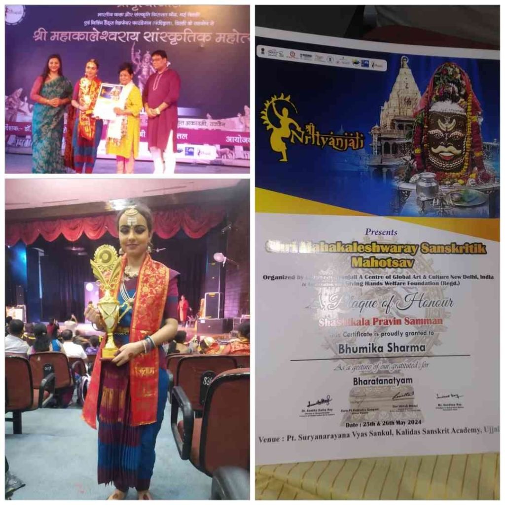 बिल्हा । श्री नृत्यान्जलि फाउंडेशन के तत्वाधान में पंडित विकास नारायण शुक्ला सभागार कालिदास संस्कृत अकादमी उज्जैन में महाकालेश्वर सांस्कृतिक महोत्सव कार्यक्रम जहां कथक,भरतनाट्यम ,ओडीसी जैसी अनेक उत्कृष्ट सांस्कृतिक प्रस्तुतियों के लिए देश भर से सैकड़ो कलाकारों ने भाग लिया विगत दिनों संपन्न हुआ | जिसमे बिल्हा नगर की प्रतिभावान कलाकार भूमिका शर्मा पिता नारायण शर्मा को शशि कला प्रवीण सम्मान से सम्मानित किया गया । भूमिका बाल्य काल से ही मंचों पर प्रस्तुति दे रही है और नृत्य, संगीत के क्षेत्र में गहरी रुचि रखती रही है| भूमिका भरतनाट्यम लंबे समय से सीख रही हैं यह परिवार के साथ साथ पूरे नगर के लिए गौरव और हर्ष का विषय है | जो उनको सम्मानित किया गया।