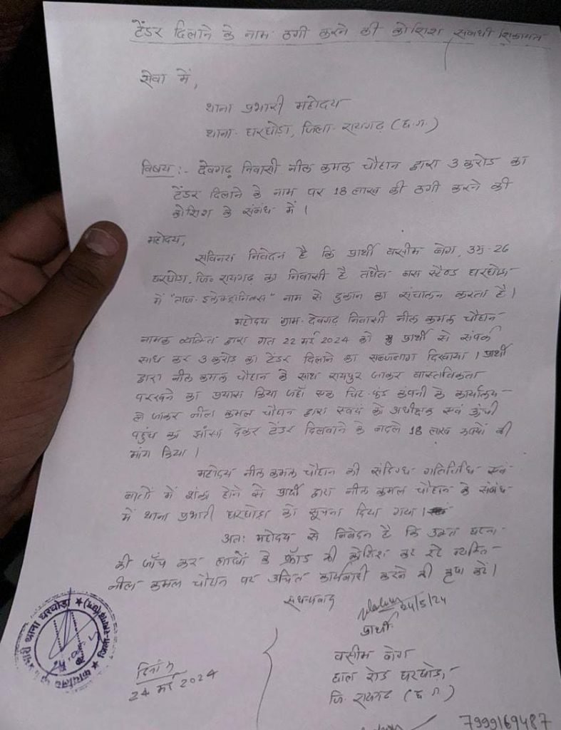 रायगढ़(गंगा प्रकाश)।घरघोड़ा के एक युवा व्यवसायी के साथ 18 लाख रुपयों के फ्रॉड की कोशिश की सनसनीखेज खबर सामने आई है । घरघोड़ा के व्यवसायी वसीम बेग को 3 करोड़ का टेंडर दिलाने के नाम पर 18 लाख रुपये मांगे गए थे पर युवा व्यवसायी को शंका होने पर जागरूकता का परिचय देते हुए व्यवसायी ने पुलिस को सूचना दे दी और फ्रॉड करने वाले संदिग्ध को पुलिस को सौंप दिया ।