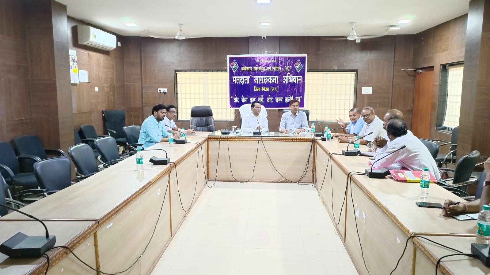बेमेतरा (गंगा प्रकाश)।  कलेक्टर एवं जिला निर्वाचन अधिकारी पी.एस.एल्मा ने आगामी विधानसभा निवार्चन को लेकर आज यहां कलेक्टोरेट के दृष्टि-सभाकक्ष में राजनीतिक दलों के प्रतिनिधियों के साथ बैठक की। उन्होंने राजनीतिक दलों के प्रतिनिधियों को निर्वाचन में उनकी क्या जिम्मेदारी होती है इसकी जानकारी दी और निर्वाचन आयोग की गाइडलाइन से अवगत कराया। बैठक में अपर कलेक्टर श्री छन्नू लाल मारकण्डे, उप जिला निर्वाचन अधिकारी धनराज मरकाम, ईडीएम महेन्द्र वर्मा सहित राजनीतिक दलों के प्रतिनिधि उपस्थित थे।