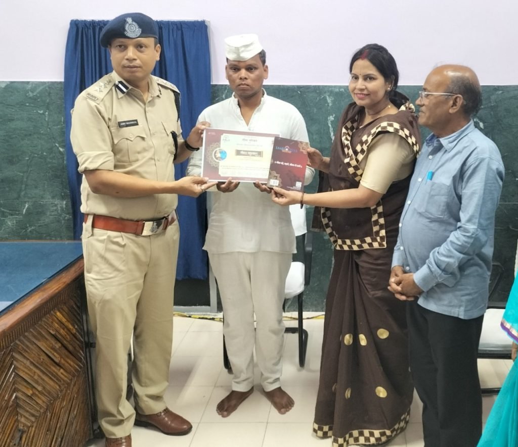 रायपुर । बंदियों के मानसिक एवं आध्यात्मिक उत्थान हेतु केन्द्रीय जेल रायपुर जेल प्रशासन एवं गीता परिवार के संयुक्त प्रयास से बंदियों को प्रतिदिन 01 घंटे गीता का ज्ञान तथा शुद्ध उच्चारण का प्रशिक्षण दिया जा रहा है। वर्तमान में 21 कैदियों द्वारा गीता पाठकर गीता परिवार द्वारा आयोजित परीक्षा उत्तीर्ण कर लिया गया है। इस अवसर पर जेल अधीक्षक अमित शांडिल्य द्वारा कैदियों से गीता सुनी गई तथा उन्हें प्रमाण पत्र प्रदाय किया गया। जेल अधीक्षक श्री शांडिल्य ने गीता के अध्याय 2 के श्लोक क्रमांक 38 का उदाहरण देते हुए कहा कि व्यक्ति को सुख-दुख, लाभ-हानि तथा विजय-पराजय में समान रहना चाहिये तथा निरंतर कर्मवान रहना चाहिए। केन्द्रीय जेल रायपुर जेल प्रशासन तथा गीता परिवार के इस प्रयास से बंदी जेल में अपने जेल आने के कारण को स्वीकार कर अपने समस्त जिज्ञासाओं का समाधान करते हुए जीवन के प्रति सकारात्मक हो रहे है। इस अवसर पर गीता परिवार की ओर से गीता की पुस्तकें वितरित की गई। गीता की परीक्षा उत्तीर्ण किये बंदियों को जेल अधीक्षक श्री शांडिल्य द्वारा विशेष परिहार देने की घोषणा की गई। गीता परिवार की ओर से श्रीमती सीमा मिश्रा मास्टर ट्रेनर एवं अन्य 04 सदस्य उपस्थित रहे।