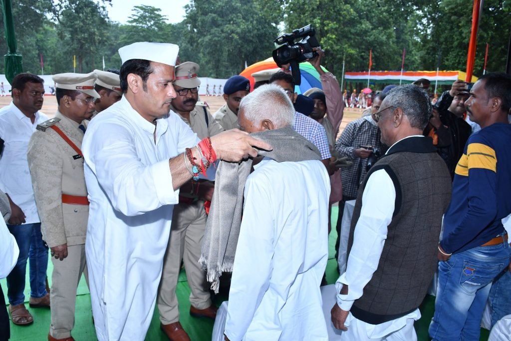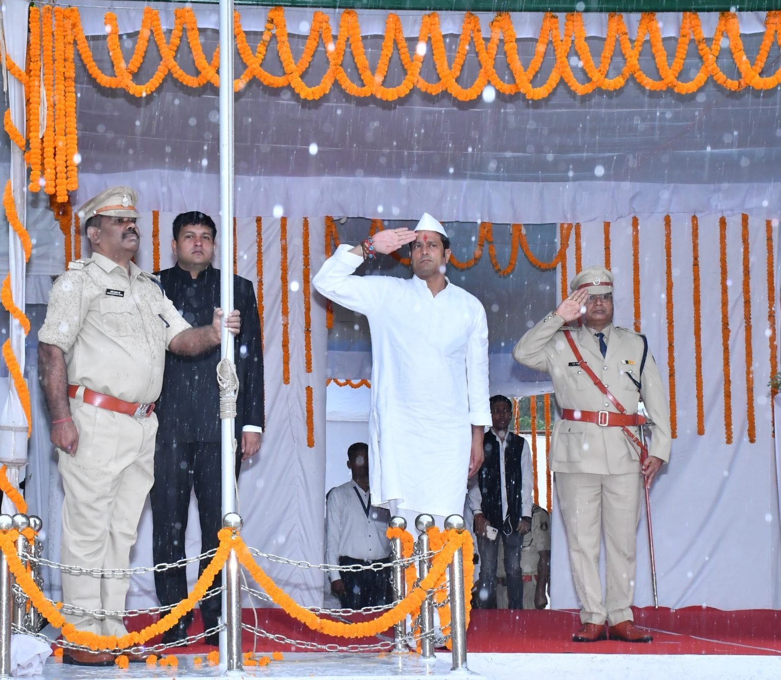 गरियाबंद(गंगा प्रकाश)। जिला मुख्यालय गरियाबंद के पुलिस परेड ग्राउंड में आज भारी बारिश के बीच स्वतंत्रता दिवस का 75वां वर्षगांठ गरिमामय माहौल में मनाया गया। छत्तीसगढ़ शासन के संसदीय सचिव श्री विकास उपाध्याय ने मुख्य समारोह में ध्वजारोहण कर परेड की सलामी ली। मंच पर कलेक्टर प्रभात मलिक एवं पुलिस अधीक्षक जे.आर. ठाकुर उपस्थित थे। तिरंगा फहराने के बाद सभी उपस्थित नागरिकों ने राष्ट्रगान गाया। समारोह के मुख्य अतिथि श्री उपाध्याय ने जनता के नाम मुख्यमंत्री भूपेश बघेल के संदेश का वाचन किया। मुख्य अतिथि ने खुशहाली के प्रतीक गुब्बारे को आसमान में छोड़ा। इस दौरान लगातार बारिश से भी लोगों के उत्साह में कमी नहीं दिखाई दी। समारोह में परेड कमांडर रक्षित निरीक्षक उमेश कुमार राय के निर्देशन में मुख्य अतिथि को सलामी दी गई। इस अवसर पर मुख्य अतिथि ने शहीद परिवार के परिजनों से मुलाकात कर उन्हें साल और श्रीफल देकर सम्मानित किया।
