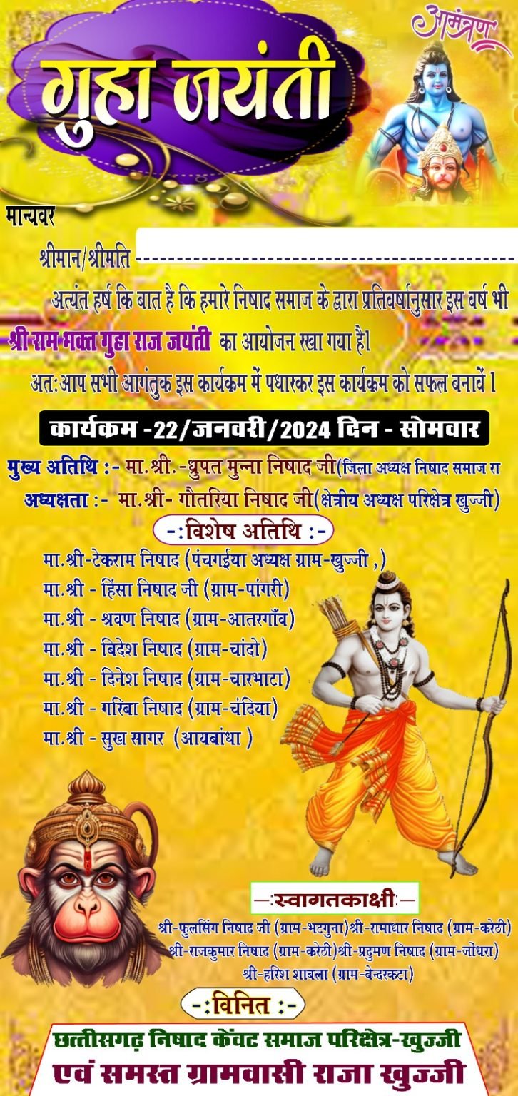 डोंगरगांव(गंगा प्रकाश) । छत्तीसगढ़ निषाद केंवट समाज परिछेत्र खुज्जी एवम समस्त ग्राम वासियो के द्वारा 22 जनवरी को स्थानीय ग्राम खुज्जी में भक्त राज गुहा की जयंती को अयोध्या उत्सव के सांथ समारोह पूर्वक मनाया जाएगा,उक्त आयोजन में खुज्जी परिछेत्र के निषाद समाज के लोग जयंती में शामिल होंगे