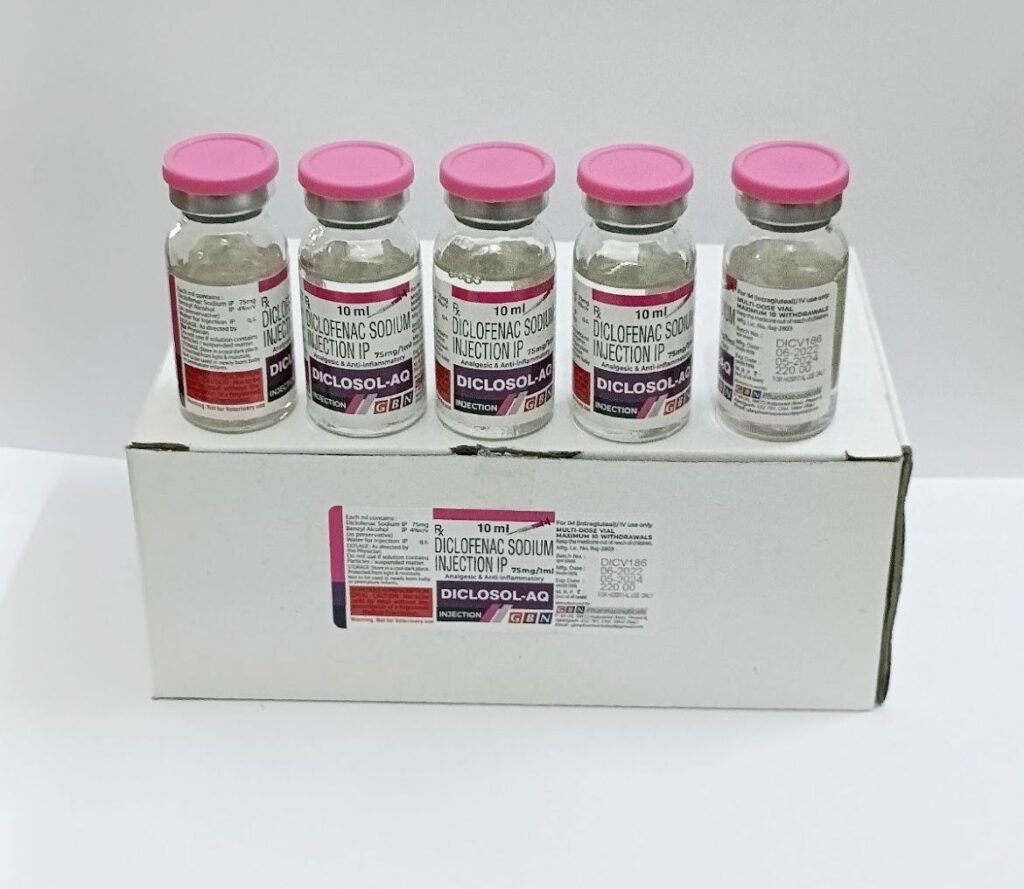 DICLOFANIC _AQ के 30 एमएल वायल का पहले उत्पादन होता था,दर्द की इस दवा का उपयोग मवेशियों के इलाज में भी कर दिया जाता था।लेकिन मवेशियों के मरने के बाद , मरे मवेशी के मांस खाने वाले चिल कौवा की मौत हो जाती थी।2015 में ड्रग के नेशनल आथारटी ने 30 एमएल वायल पर प्रतिबंध लगाते हुए,10 एम एल के वायल उत्पादन की छूट निर्धारित कंटेंट में संशोधन के बाद दिया था।