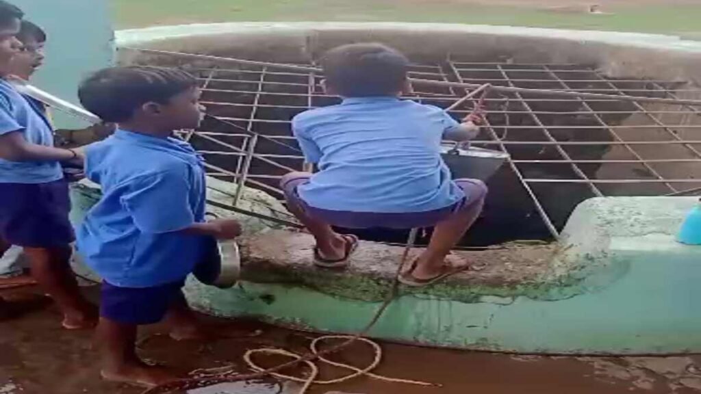 गरियाबंद/फिंगेश्वर (गंगा प्रकाश)। फिंगेश्वर ब्लॉक मुख्यालय की शासकीय प्राथमिक स्कूल भेंड्री के नौनिहाल बच्चे जान जोखिम में डालकर गहरे कुएं से पानी निकाल रहे हैं। इसके चलते कभी भी बड़ा हादसा हो सकता है। स्कूल परिसर में कुए से पानी निकालने का काम बकायदा स्कूल के नौनिहाल बच्चों की नियमित दिनचर्या में शामिल है। स्कूल खुलने के बाद बच्चों के पीने के लिए पानी की व्यवस्था से लेकर दोपहर मध्यान भोजन पर परोसने तक के काम में स्कूली बच्चों द्वारा भरा गया पानी खाने पीने से लेकर बर्तन धोने तक उपयोग में लाया जाता है। प्रदेश के मुखिया द्वारा शिक्षा के गुणवत्ता में सुधार लाने नित नए अभिनव पहल करने के साथ ही करोड़ों रुपए की योजना स्वीकृत किए जाते हैं। इसके बावजूद स्कूल के जिम्मेदार शिक्षकों की लापरवाही का खामियाजा ग्रामीणों को भुगतना पड़ता है। इतना सब होने के बावजूद स्कूल प्रधान पाठक अजय साहू से इस मामले की जानकारी लेने पर वह गोलमोल जवाब देते हुए सही जानकारी देने से बचते रहें। ग्रामीण पालक स्कूल में बच्चों को पढ़ने भेजते हैं। लेकिन स्कूल के जिम्मेदार शिक्षक की उपस्थिति में बच्चे जान जोखिम में डालकर पानी भरते हैं।