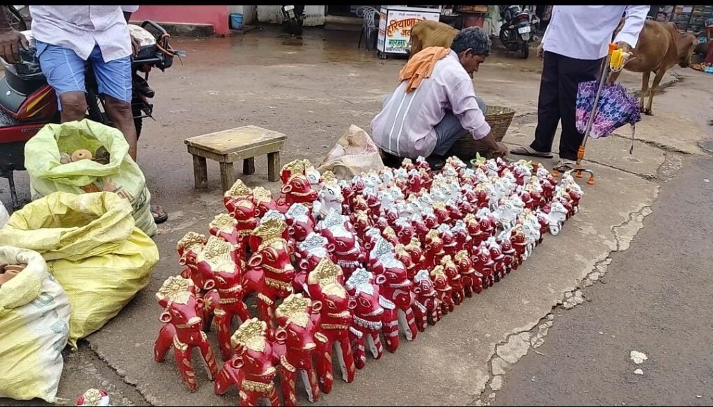 फिंगेश्वर(गंगा प्रकाश)। शहर मे एक बार फिर प्रमुख पर्व तीजा पोरों को लेकर चहल पहल का वातावरण बन गया है। बाजार मे पोला पर्व को लेकर नांदिया बैल की बिक्री शुरू हो गई है अनेक स्थानो पर मिटटी से बने बैल एवं लकड़ी से बने बैल बिक्री के लिये बडे पैमाने पर सज गये है। पोला पर्व मे आम तौर पर कृषक परिवारों द्वारा कृषि कार्य में उपयोग मे आने वाले बैल की पूजा अर्चना करने का विधान है जिसके चलते इस दिन बैल को नहला धुलाकर साज सज्जा के साथ उसकी पूजा अर्चना की जाती है साथ हीं इस दिन खेती कार्य मे जाने की मनाही होती है।वहीं पोला पर्व पर आम लोगों के घरों मे नांदिया बैल के प्रतीक स्वरूप मिटटी के बने बैल की पूजा अर्चना कर उन्हे छत्तीसगढिया व्यंजन चीला, गुलगुला भजिया, पुडी, चौसेला, आलू भजिया, मिर्ची भजिया, नमकीन भजिया एवं खिचड़ी बनाकर उत्साह पूर्वक पर्व मनाया जाता है।पोला पर्व को लेकर शहर के अनेक चौक चौराहो पर मिटटी व लकड़ी के बने नांदिया बैल बड़े पैमाने पर बिक्री के लिये उपलब्ध है इस वर्ष भी उक्त मिटटी व लकड़ी निर्मित बैल महंगाई की मार की वजह से महंगे दामो पर बिक रहे है मिटटी के बैल जहां 50 रूपये जोड़ी पर बेचे जा रहे है वहीं लकड़ी निर्मित बैल 60-70 रूपये के बीच बिक्री के लिये उपलब्ध है। मिट्टी का खिलौना भी 40 रूपये सेट में बेचा जा रहा है।आज 13 सितंबर बुधवार को दिनभर बदली और रह रह कर हुई वर्षा के कारण कुम्हारो का धंधा काफी कम रहा।जबकि आज ही सबसे ज्यादा बिक्री की बात कही जा रही थी।