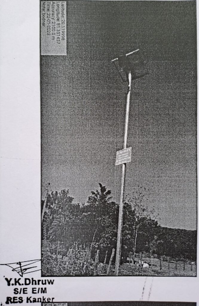 सूचना के अधिकार से मांगी गई जानकारी में पेपर वर्क पूर्ण किए गए हैं जिसमें पेपर में भौतिक सत्यापन का कार्य ग्रामीण यांत्रिकी सेवा संभाग के उप अभियंता किशोर ध्रुव द्वारा किया गया है, वही मजे की बात यह है कि इन स्ट्रीट लाइट के खंभों के जियोटेक वाली फोटो में सोलर लाइट की अनुशंसा सांसद मोहन मंडावी द्वारा कराए जाने की बात लिखी गई है।