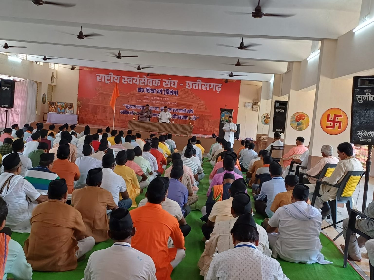 मुंगेली । राष्ट्रीय स्वयंसेवक संघ छत्तीसगढ़ प्रान्त (आरएसएस) द्वारा संघ शिक्षा वर्ग सरस्वती शिशु मंदिर, पेंडाराकापा, मुंगेली में 23 मई से 7 जून तक संघ शिक्षा वर्ग का सफलतापूर्वक आयोजन किया गया। इस महत्वपूर्ण कार्यक्रम में छत्तीसगढ़ के सभी जिलों से 146 प्रशिक्षार्थियों ने भाग लिया, जिसमें मूँगेली नगर एवं बाहर से 45 कार्यकर्ता व्यवस्था में थे। इस 15 दिवसीय प्रशिक्षण वर्ग का उद्घाटन केंद्रीय स्तर के दो अधिकारियों द्वारा किया गया, जिनके साथ क्षेत्र, प्रांत, विभाग और जिला स्तर के विभिन्न अधिकारी एवं कार्यकर्ता भी उपस्थित रहे। प्रशिक्षण कार्यक्रम का मुख्य उद्देश्य योग्य कार्यकर्ता निर्माण कर समाज में आवश्यक परिवर्तन करने हेतु स्वयंसेवकों को बौद्धिक और शारीरिक रूप से सशक्त बनाना और देशभक्ति की भावना को प्रबल करना था। प्रशिक्षण वर्ग के दौरान, बौद्धिक प्रशिक्षण के विभिन्न सत्र आयोजित किए गए। इनमें संवाद सत्र, बौद्धिक सत्र, अभ्यास सत्र, चर्चा सत्र, गीत, सुभाषित का प्रशिक्षण आदि शामिल रहा। इन सत्रों का उद्देश्य स्वयंसेवकों को ज्ञानवर्धक जानकारी प्रदान करना और उन्हें समाज के प्रति उनकी जिम्मेदारियों से अवगत कराना था। बौद्धिक प्रशिक्षण के साथ-साथ, शारीरिक प्रशिक्षण पर भी विशेष ध्यान दिया गया। इसमें दंड योग, पद विन्यास, एवं विभिन्न अन्य शारीरिक अभ्यास शामिल थे। शारीरिक प्रशिक्षण का उद्देश्य स्वयंसेवकों को शारीरिक रूप से सशक्त और स्वस्थ बनाना था, ताकि वे समाज की सेवा बेहतर तरीके से कर सकें।