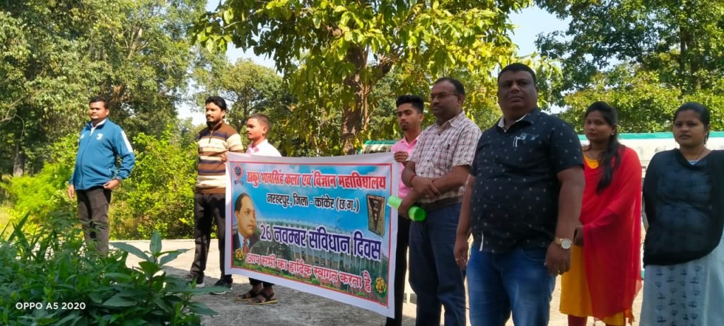 नरहरपुर (गंगा प्रकाश)। दिनांक 26/11/2022 को ठाकुर भाव सिंग कला एवं विज्ञान महाविद्यालय नरहरपुर में संविधान दिवस के अवसर पर संविधान के प्रस्तावना का वाचन किया गया। साथ ही साथ 26/11 को मुंबई आतंकी हमले में शहीद हुए जवानों एवं निर्दोष लोगों के शहादत पर दो मिनट का मौन धारण कर श्रद्धांजलि अर्पित किया गया।साथ ही संविधान दिवस के अवसर पर महाविद्यालय में संगोष्ठी का आयोजन किया गया जिसमे प्राचार्य डॉ. लक्ष्मण शुक्ला,प्रो.मुकेश नेताम, प्रो.देवेंद्र सिंहसार, प्रो. नरेंद्र नागवंशी, प्रो. नरोत्तम कौशिक,प्रो.सहजवती साहू, और प्रो.रितु साहू के द्वारा संविधान के उद्देश्य, सार्थकता एवं उपयोगिता पर प्रकाश डालते हुए संविधान के महत्व को बताया गया साथ ही साथ महाविद्यालयीन छात्र छात्राओं के द्वारा भी संविधान दिवस के अवसर पर डॉ. भीमराव अंबेडकर के जीवन गाथा, संघर्ष और संविधान की आवश्यकता और उपयोगिता के उपर प्रकाश डालते हुए संबोधित किया गया। कार्यक्रम का आयोजन महाविद्यालय प्रमुख प्राचार्य डॉ. लक्ष्मण शुक्ला के मार्गदर्शन और नेतृत्व में किया गया। इस अवसर पर प्राचार्य सभी टीचर, कर्मचारी, और महाविद्यालय के विद्यार्थी उपस्थित रहे।