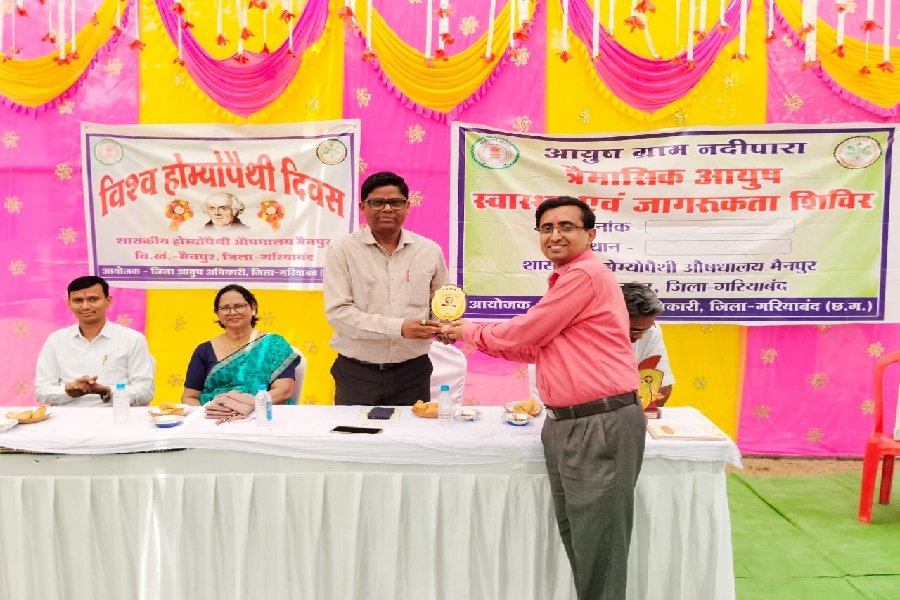 मैनपुर (गंगा प्रकाश)। गरियाबंद जिला के विकासखंड मैनपुर अंतर्गत आयुष ग्राम मैनपुर के अचानपुर में आज दिनांक 8/4/2025 को जिला आयुष अधिकारी के मार्गदर्शन में होम्योपैथिक चिकित्सा अधिकारी डॉ सुमन बागची के तत्वाधान में त्रमासिक आयुष जन जागरुकता शिविर का आयोजन किया गया । जिसमें अतिथियो के द्वारा सेमवैल हनिमेन एवं भगवान धन्वंतरि का पूजा अर्चना के पश्चात स्वास्थ्य शिविर का शुभारंभ किया गया इस बीच डॉक्टर सुमन बागची ने होम्योपैथी उपचार के संबंध में लोगों को जागरूक किया साथ ही होम्योपैथिक के संबंध में लोगों को जानकारी दी । कार्यक्रम के अंत में होम्योपैथी व स्वास्थ्य के संबंध में अत्यधिक प्रसार करने वाले शिक्षकों का मोमेंटो के साथ सम्मान किया गया आज के इस कार्यक्रम में मुख्य रूप से डॉक्टर सुमन बागची, डाक्टर प्रिया वर्मा,चित्रसेन पटेल प्रधान पाठक ,सोनबरसन साहू प्रोफेसर ,श्रीमती कमला देवांगन शिक्षिका, कमल बारिहा प्रधान पाठक बलराम ध्रुव, श्रीमती यमुना पटेल, श्रीमती सुहागा पांड़े के अलावा भारी संख्या में ग्रामीण जन कार्यक्रम में उपस्थित थे ।