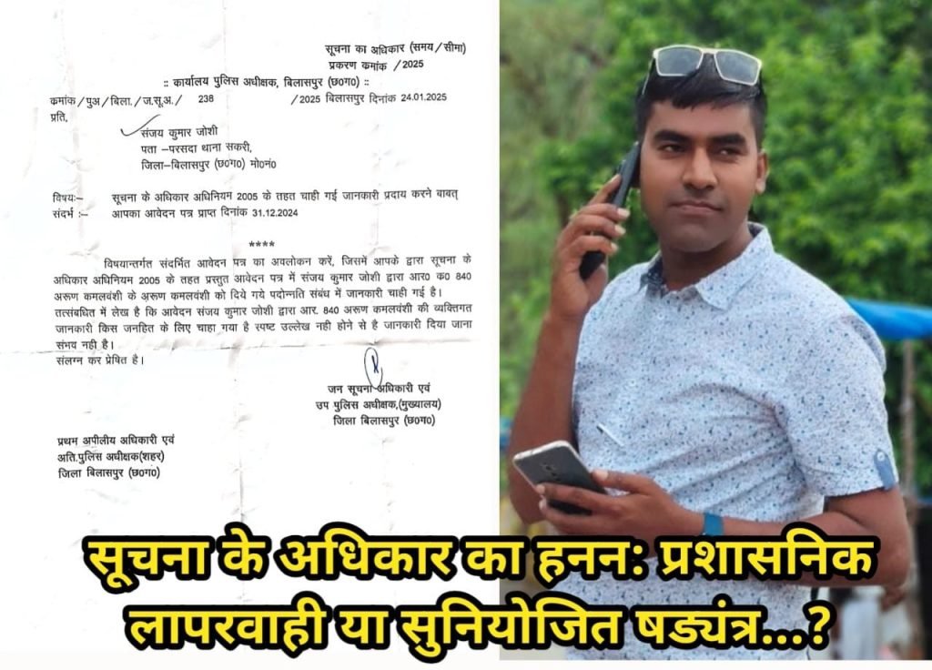 बिलासपुर (गंगा प्रकाश)। आरक्षक क्रमांक 840 अरुण कुमार कमलवंशी की पदोन्नति से जुड़ी जानकारी को लेकर दायर सूचना के अधिकार (RTI) आवेदन पर प्रशासन का टालमटोल और जवाब में देरी संजय जोशी के लिए संदेहास्पद बन गई है। उन्होंने आरोप लगाया कि बिलासपुर पुलिस अधीक्षक कार्यालय सहित अन्य संबंधित कार्यालय जानबूझकर आरोपी को संरक्षण दे रहे हैं और अपराधों को बचाने का प्रयास किया जा रहा है।