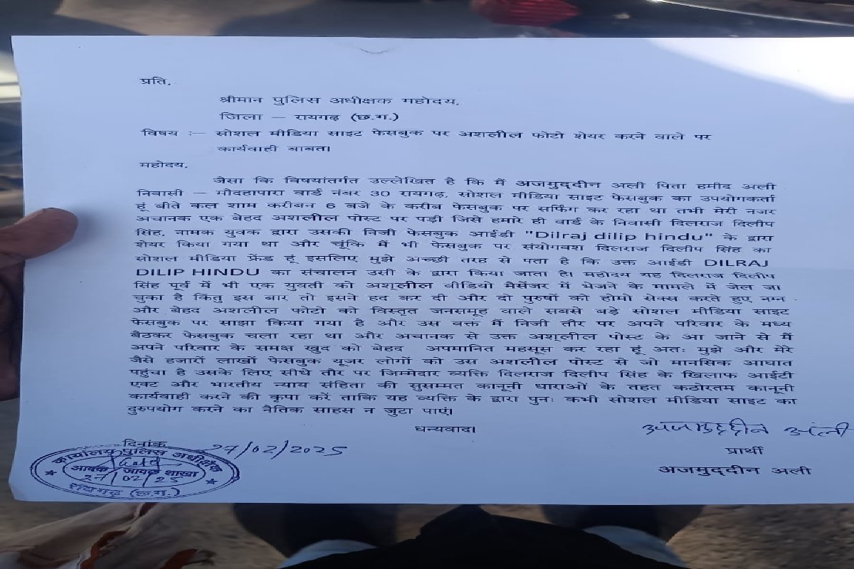 रायगढ़ (गंगा प्रकाश)। कला एवं संस्कृति की नगरी रायगढ़ से इन दिनों विभिन्न सोशल मीडिया साइटस और फेसबुक पर धर्म विशेष को टारगेट करते हुए दिलराज दिलीप नाम के एक असामाजिक युवक के द्वारा बार_बार अश्लील और आपत्तिजनक फोटो वीडियो शेयर करने का मामला सामने आया है। जिसे लेकर मुस्लिम समाज में गहरी नाराजगी देखी जा रही है।