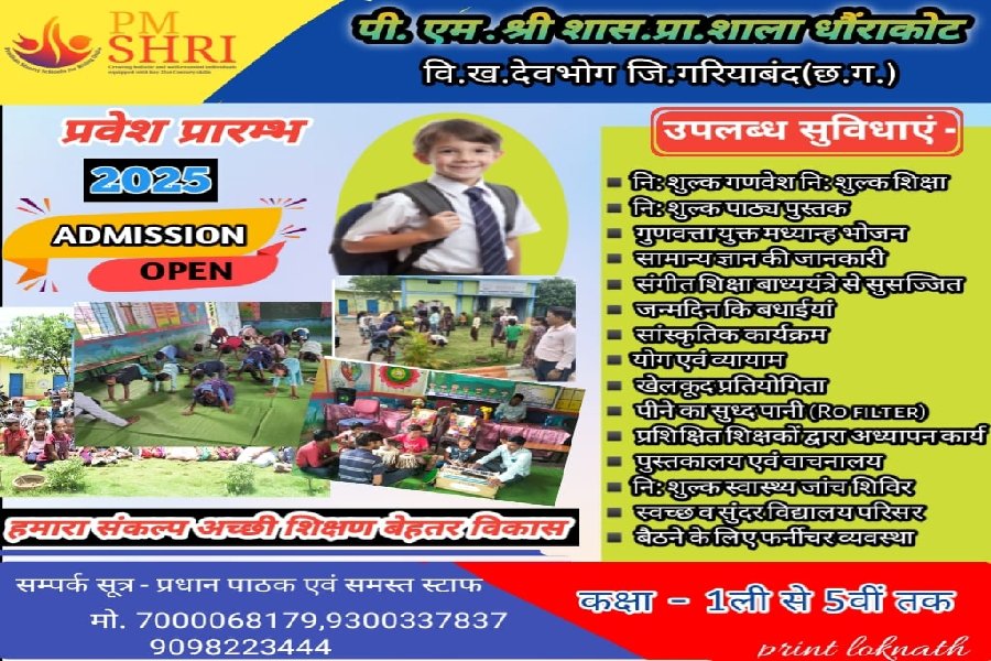 देवभोग/गरियाबंद (गंगा प्रकाश)। शासकीय स्कूल लेकिन निजी स्कूल जैसी पढ़ाई! “जहाँ चाह होती है, वहाँ राह निकल ही आती है” — इस कहावत को साकार कर रहा है गरियाबंद जिले का एक सरकारी स्कूल, जो आज निजी स्कूलों को कड़ी टक्कर दे रहा है। जी हाँ, हम बात कर रहे हैं पी.एम. श्री शासकीय प्राथमिक शाला, धौंराकोट की, जो विकासखंड देवभोग में स्थित है और अब जिलेभर में एक आदर्श शासकीय स्कूल के रूप में उभरकर सामने आ रहा है।