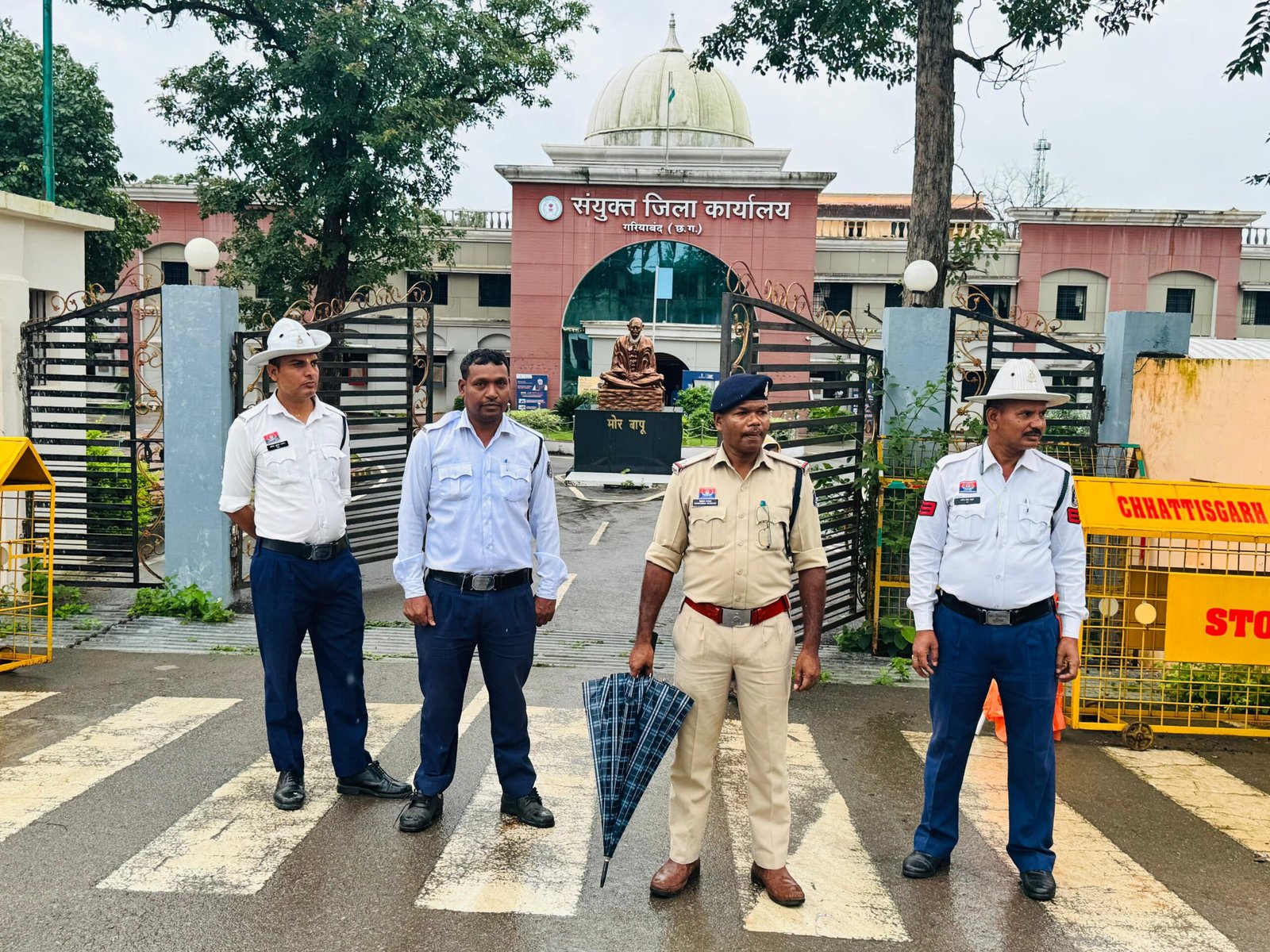 गरियाबंद (गंगा प्रकाश)। हेलमेट नहीं तो एंट्री नहीं: गरियाबंद कलेक्टोरेट में मंगलवार की सुबह कुछ अलग ही नज़ारा देखने को मिला। आसमान से मूसलधार बारिश हो रही थी, मगर ट्रैफिक पुलिस के जवान पूरी मुस्तैदी से मुख्य द्वार पर तैनात थे। भीगते हुए, वे आने-जाने वाले हर व्यक्ति को रोककर केवल एक ही बात कह रहे थे – “हेलमेट नहीं तो एंट्री नहीं”।