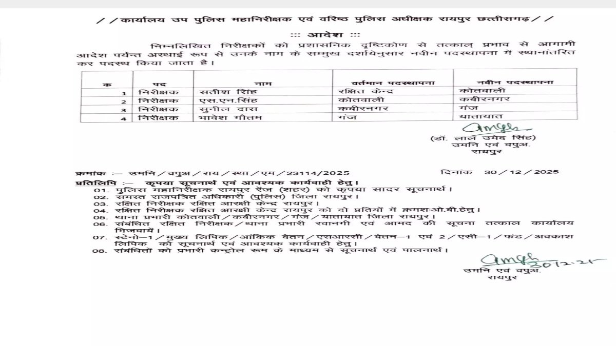 रायपुर |’ साल के अंतिम दिन रायपुर जिला पुलिस में बड़ा प्रशासनिक फेरबदल किया गया है। एसएसपी रायपुर ने देर रात तबादलों के आदेश जारी करते हुए पुलिस महकमे में व्यापक बदलाव किया है। इस आदेश के तहत 4 इंस्पेक्टर समेत कुल 55 पुलिसकर्मियों को इधर से उधर किया गया है।
