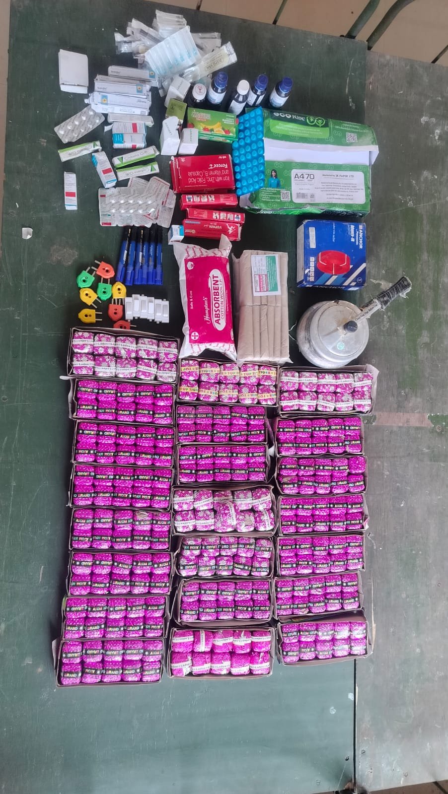 बरामदगी में — विस्फोटक, कुकर, इलेक्ट्रिक स्विच, मेडिकल टैबलेट, इंजेक्शन व दवाइयाँ।