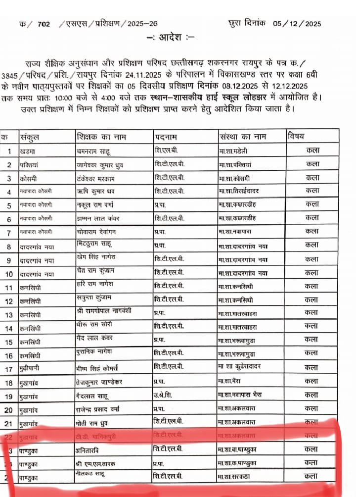 छुरा (गंगा प्रकाश)। गरियाबंद जिले के छुरा विकास खण्ड में शिक्षा विभाग की कार्यप्रणाली एक बार फिर सवालों के घेरे में आ गई है। खण्ड स्रोत समन्वयक (बीआरसी) समग्र शिक्षा छुरा द्वारा जारी किए गए एक प्रशिक्षण आदेश ने विभाग की लापरवाही, असंवेदनशीलता और प्रशासनिक अव्यवस्था को उजागर कर दिया है। स्थिति यह है कि पांच दिवसीय प्रशिक्षण के लिए न केवल वर्तमान में कार्यरत शिक्षकों को बुलाया गया है, बल्कि एक स्वर्गवासी शिक्षक, बस्तर में पदस्थ शिक्षिका, मेडिकल अवकाश पर चल रहे शिक्षक और यहां तक कि तबादला हो चुके कर्मचारियों के परिजनों तक को नोटिस भेज दिया गया है।
