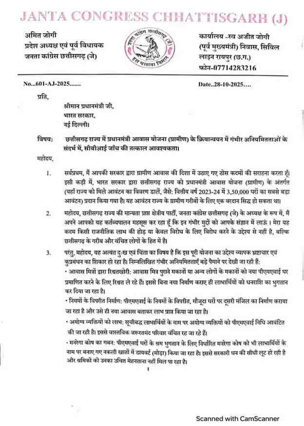रायपुर। जनता कांग्रेस छत्तीसगढ़ (J) के अध्यक्ष अमित जोगी ने प्रधानमंत्री नरेंद्र मोदी को पत्र लिखकर प्रधानमंत्री आवास योजना (PMAY) में हुए कथित घोटाले की CBI जांच की मांग की है। उन्होंने पत्र में लिखा कि यह योजना केंद्र सरकार की गरीबों के लिए सबसे बड़ी पहल थी, लेकिन इसे भ्रष्टाचार की भेंट चढ़ा दिया गया है।