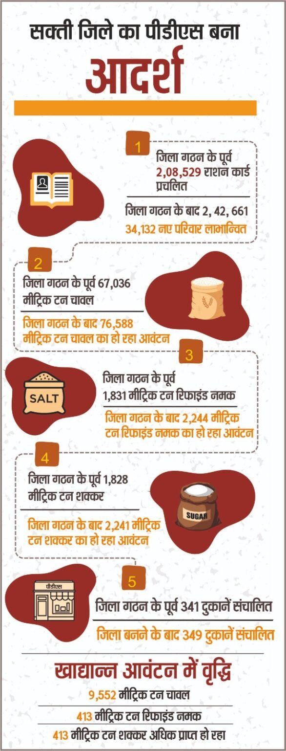 नवगठित सक्ती जिला बनने के बाद खाद्यान्न आबंटन में भी उल्लेखनीय वृद्धि दर्ज की गई है। जिला बनने के पूर्व 67 हजार छत्तीस मीट्रिक टन चावल, 1 हजार 8 सौ इकत्तीस मीट्रिक टन रिफाईड नमक, 1 हजार 8 सौ 28 मीट्रिक टन शक्कर का आबंटन प्राप्त होता था। जिला बनने के बाद 76 हजार 5 सौ 88 मीट्रिक टन चावल, 2 हजार 2 सौ 44 मीट्रिक टन रिफाईड नमक, 2 हजार 2 सौ 41 मीट्रिक टन शक्कर का आवंटन प्राप्त होता है। इस प्रकार आबंटन में 9 हजार 5 सौ 52 मीट्रिक टन चावल, 4 सौ 13 मीट्रिक टन रिफाईंड नमक, 4 सौ 13 मीट्रिक टन शक्कर अधिक प्राप्त हो रहा है। नवगठित सक्ती जिला निर्माण के बाद सार्वजनिक वितरण प्रणाली के तहत 8 उचित मूल्य दुकानों की संख्या मे भी वृद्धि हुई है। बता दे कि जिला बनने के पूर्व में 341 उचित मूल्य दुकानें संचालित थीं तथा वर्तमान में जिला बनने के बाद 349 उचित मूल्य दुकानें संचालित हो रही हैं।