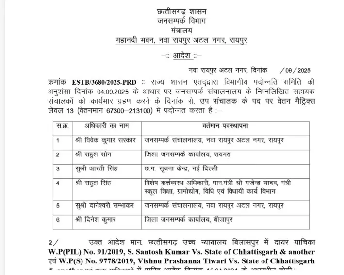 public relations department promotion रायपुर | 7 अक्टूबर 2025| छत्तीसगढ़ शासन के जनसंपर्क विभाग में कार्यरत अधिकारियों के लिए खुशखबरी है। विभाग में कार्यरत 6 सहायक संचालकों को पदोन्नति देकर उपसंचालक बनाया गया है। इस संबंध में विधिवत आदेश जारी कर दिए गए हैं। हालांकि, पदोन्नति के बाद भी सभी अधिकारियों की वर्तमान पोस्टिंग यथावत रखी गई है।