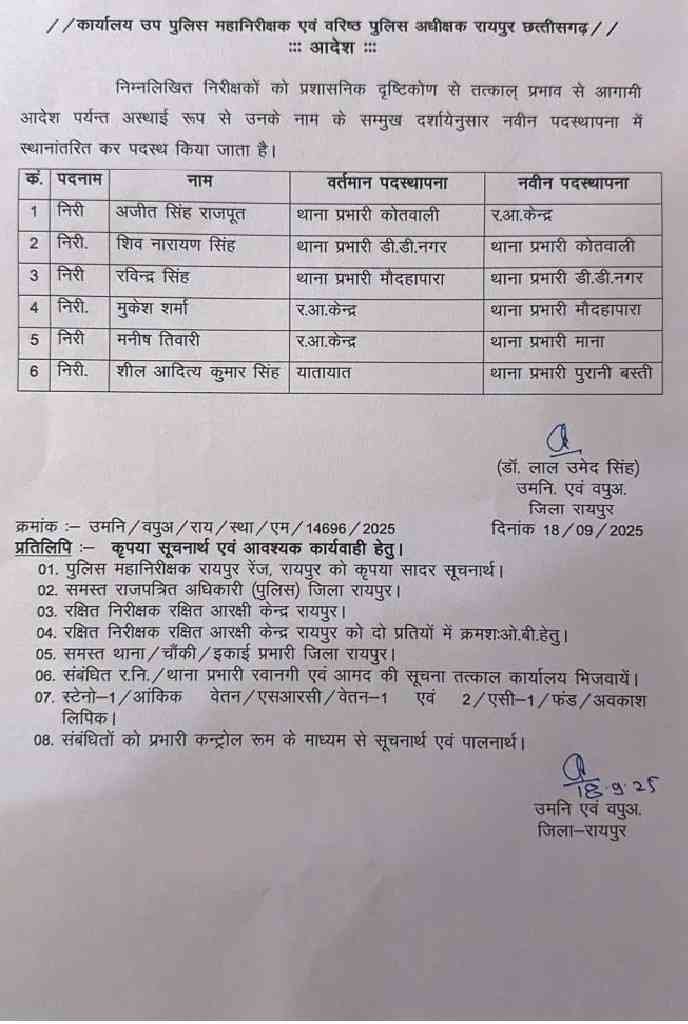 रायपुर, 18 सितंबर 2025:राजधानी रायपुर में कानून व्यवस्था को मजबूत करने और प्रशासनिक कार्यप्रणाली में सुधार लाने के उद्देश्य से वरिष्ठ पुलिस अधीक्षक (SSP) ने बड़ा कदम उठाया है। बुधवार देर शाम जारी किए गए आदेश में 6 थाना प्रभारियों (TI) का तत्काल प्रभाव से स्थानांतरण कर दिया गया है।