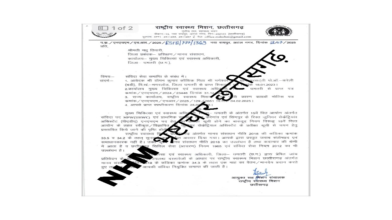 इस पूरे मामले को और भी संदेहास्पद बना दिया, रविवार के अवकाश के दिन जारी हुआ सेवा समाप्ति आदेश। रविवार को राज्य NHM कार्यालय बंद रहता है, फिर भी आदेश जारी कर उसे बैकडेट में भेजा गया। सवाल यह भी उठ रहे हैं कि क्या यह विधानसभा में भर्ती भ्रष्टाचार पर सवाल पूछे जाने से ठीक पहले की गई कार्रवाई थी, ताकि सिस्टम और अधिकारियों को बचाया जा सके?